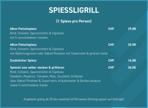 Möchtest du deinen Vereinskameraden oder Mitarbeitern nebst dem Rahmenprogramm ein spezielles Erlebnis bieten? Dann ist unser Spiessli-Grill genau das Richtige für dich.